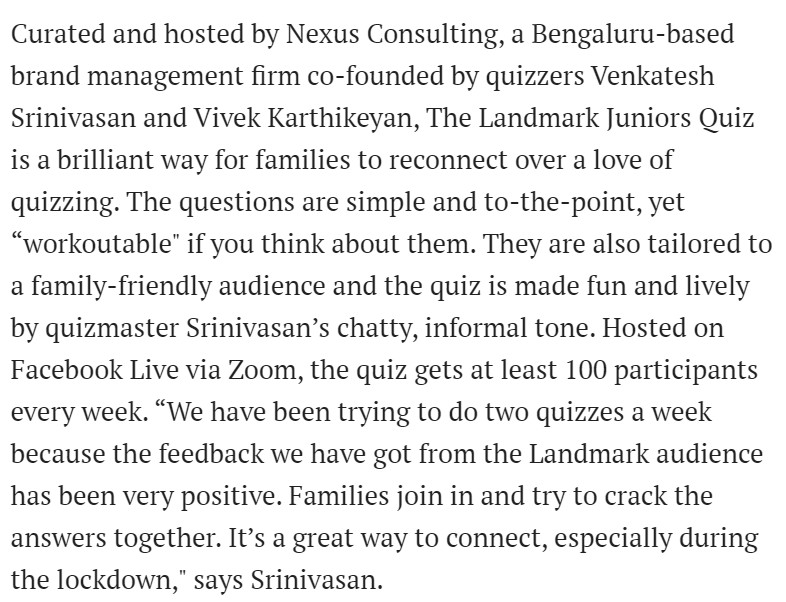 Nexus In The New We were featured in Mint, the financial daily in a write-up about online quizzing in India. The article talks about how different quiz agencies are coping with conducting events these days when online is the new normal. The original is here. news publicity Previous articleA Feature on QuizzingNext article A brand new show