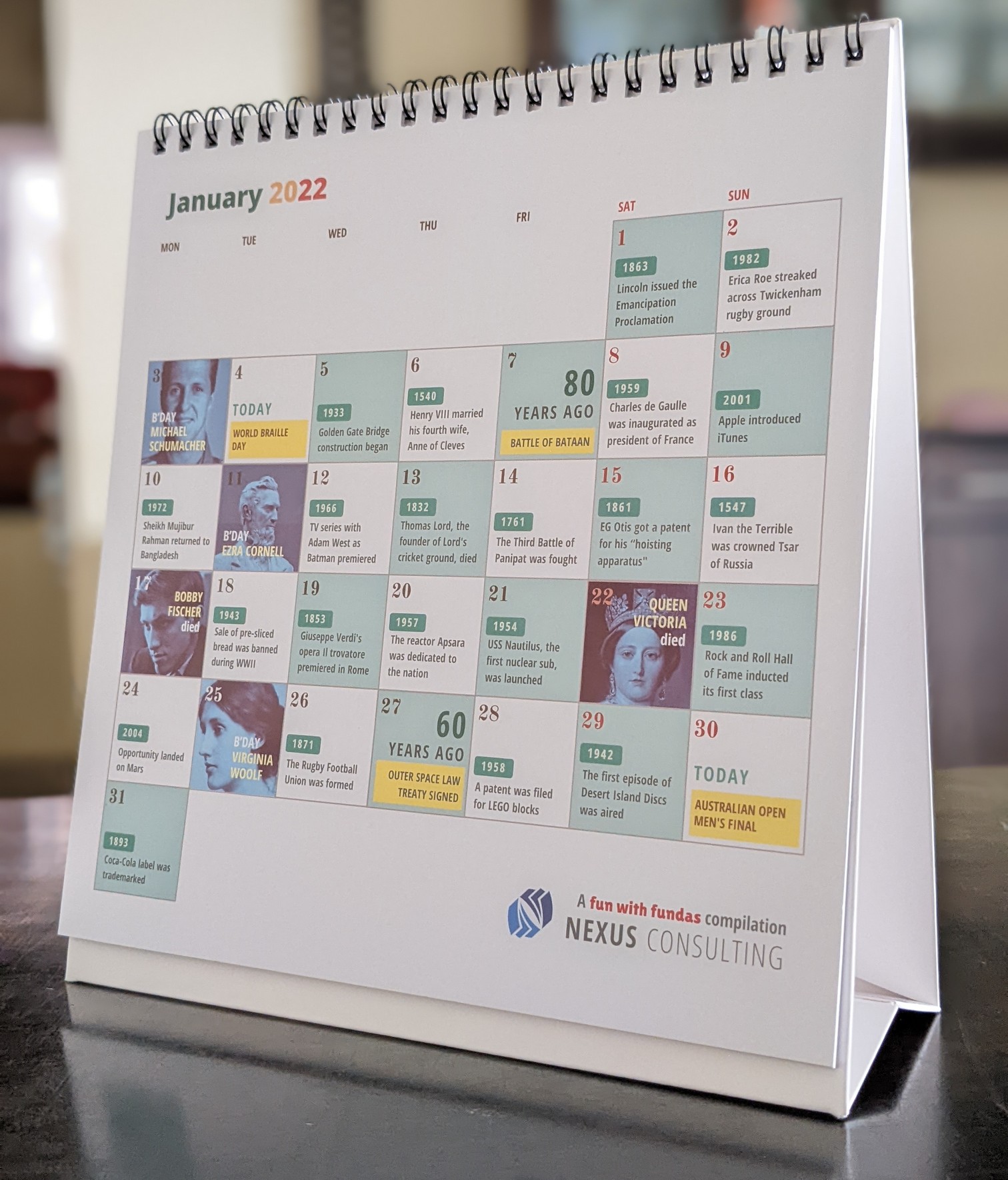 The Nexus trivia calendar is an annual “fun with fundas” publication. It is a collection of interesting historical events, birthdays, sports triumphs etc.